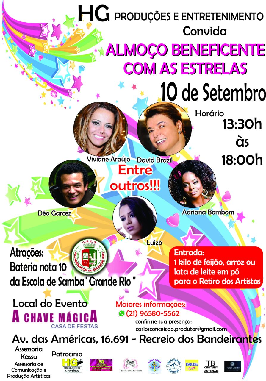 Um ”Almoço Beneficente com Estrelas” em prol do Retiro dos Artistas acontece, neste sábado, 10, às 13h, na casa de festas Chave Mágica, no Recreio dos Bandeirantes. O ingresso é um quilo de alimento não perecível ou uma lata de leite em pó. Ary Fontoura, Viviane Araújo, Kayky Brito, Rodrigo Pavanello, Benvindo Sequeira, Adriana Bombom, Jorge, Coutinho, Milton Gonçalves e Deo Garcez participam do evento que terá ainda show da cantora Luíza, a nova voz do Pop nacional.