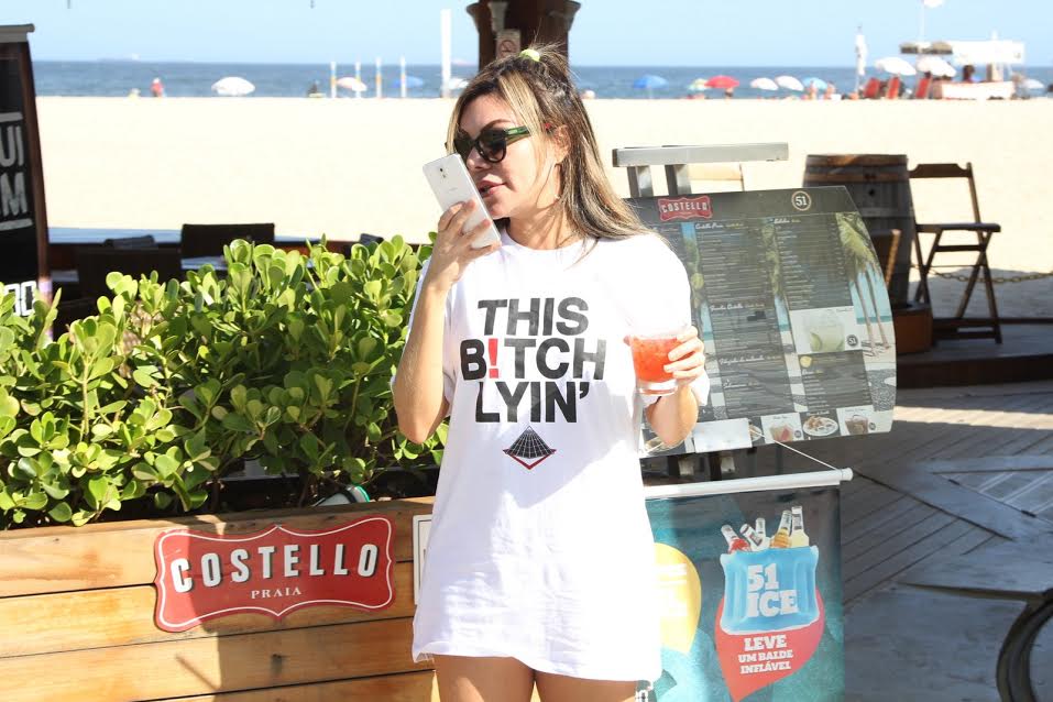 A modelo Liziane Gutierrez foi flagrada nesta quinta-feira, 9, no quiosque Costello, na praia de Copacabana, bebendo e falando ao celular. Um detalhe chamava atenção: A modelo vestia uma camisa com a frase This Bitch Lyin’ (Essa Vaca está mentindo) da grife Black Pyramid, do cantor Chris Brown, com quem a moça esteve envolvida em grande polêmica no ano passado. Foto Ag. News