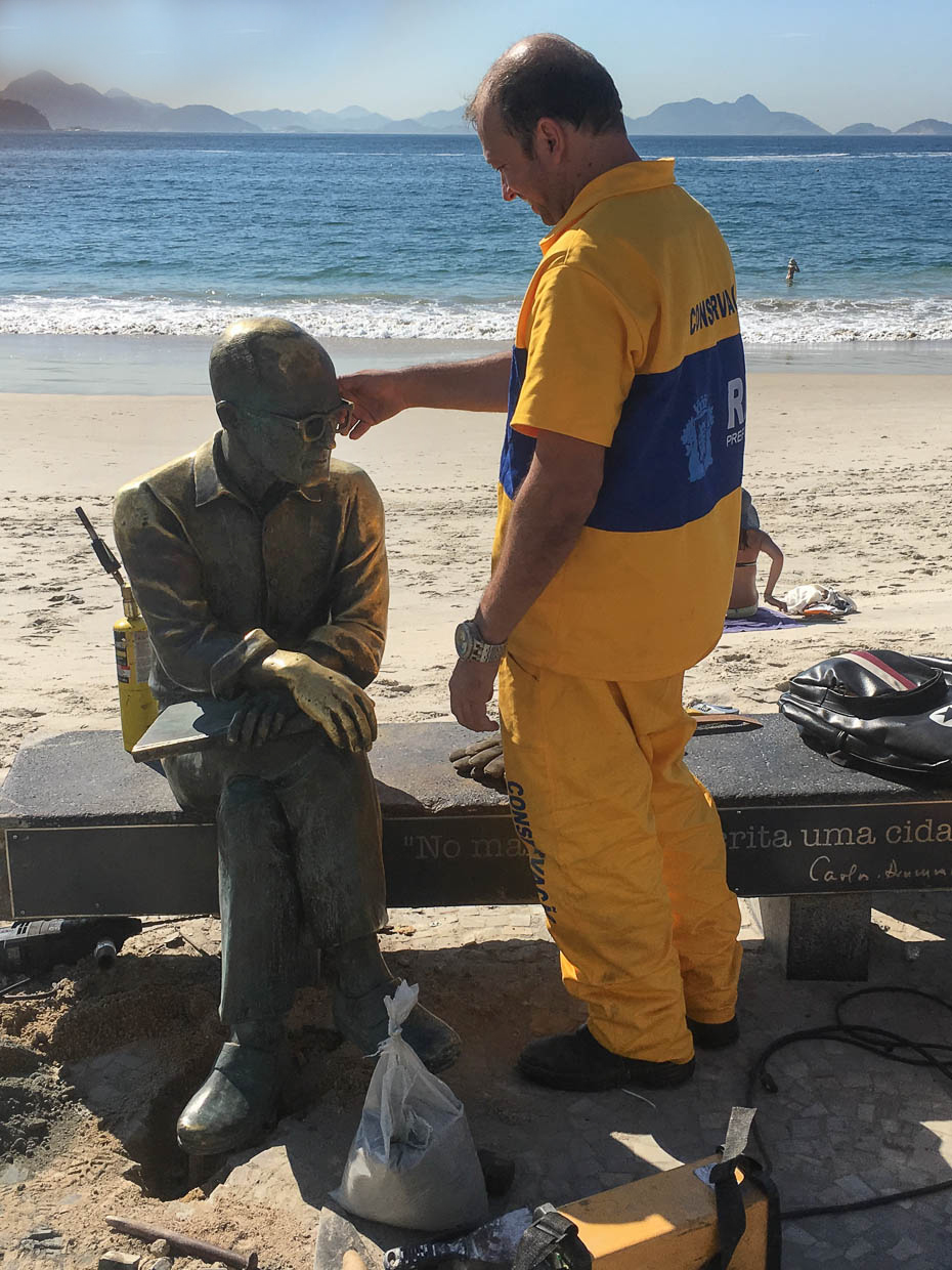 A Secretaria Municipal de Conservação e Serviços Públicos faz, nesta quarta-feira, 16, reparos estruturais na estátua de Carlos Drummond de Andrade, em Copacabana. O suporte estrutural que conecta a estátua ao banco e o suporte dos pés serão recuperados para dar maior rigidez ao monumento. Foto: José Olímpio