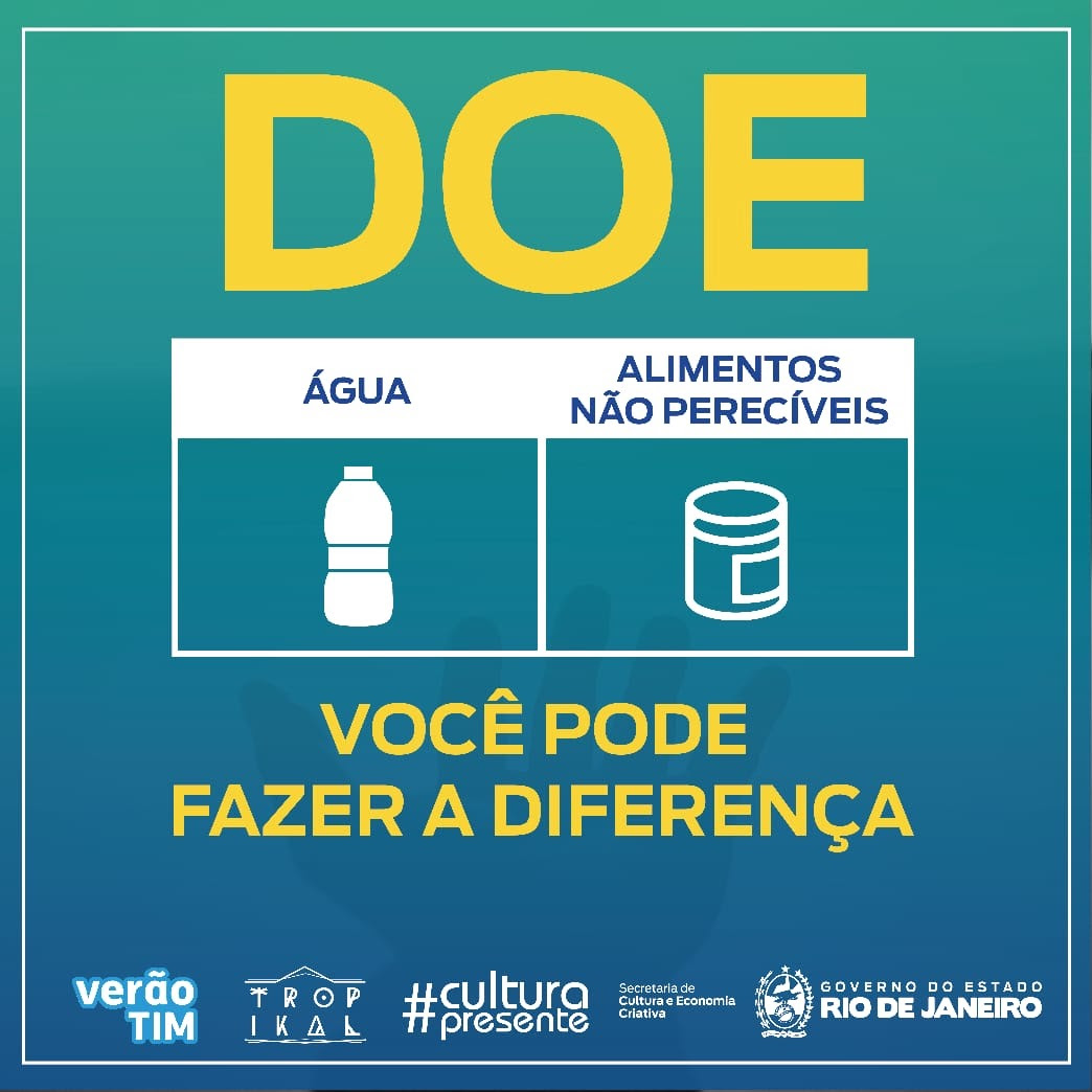 Em apoio aos milhares de desabrigados vítimas das fortes chuvas nas Regiões Norte e Noroeste, os eventos Verão Tim, que acontece na praia de Ipanema, e o Tropikal Rio, no Leblon, serão pontos de doação de água e alimentos não perecíveis para ajudar a arrecadação em solidariedade aos desalojados. No Verão Tim, que acontece nos dias 01, 02 e 09 de fevereiro, na Praia de Ipanema, as doações poderão ser feitas na tenda do RioSolidario, entre 15h e 20:30. No Tropikal Rio, evento realizado nos dias 31 de janeiro, 01 e 02 de fevereiro, na altura do Jardim de Alah, na Praia do Leblon, uma equipe estará recebendo os donativos, perto do pórtico de entrada, entre 10h e 17h. O Theatro Municipal também será um ponto de recebimento de donativos. A Biblioteca Parque Estadual, no Centro, já recebe doações desde a última segunda-feira (27).