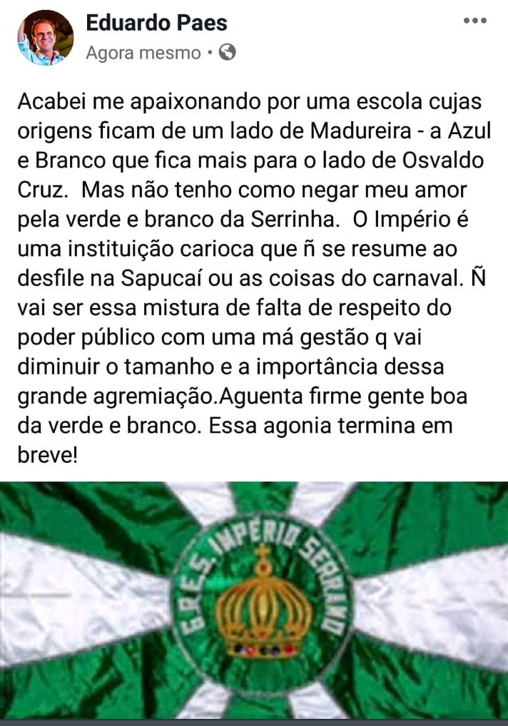Uma das mais tradicionais escola do Rio, a Império Serrano fez um desfile nesta sexta-feira, 21, que deixou entristecido o mundo do samba. Com as baianas sem a tradicional saia rodada, a escola de Madureira fez um desfile pobre e corre sérios riscos de descer. O ex-prefeito do Rio Eduardo Paes, que estava na avenida, fez, numa rede social, duras críticas a atual gestão da prefeitura e também ao presidente da verde e branco. A presidente da escola, Vera Lúcia Corrêa, acabou discutindo com algumas pessoas da agremiação e deixou a Sapucaí antes do fim do desfile.
