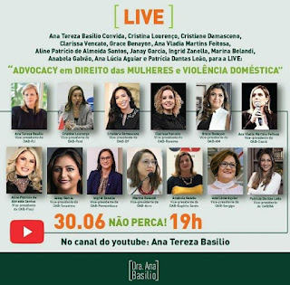 Advogados do Brasil de vários estados do país participam, dia 30, às 19h, de uma grande live com o tema “Advocacy” em Direito das Mulheres e Violência Doméstica. Estão confirmadas as participações das vices-presidentes da entidade no Pará, Cristina Lourenço, no Distrito Federal, Cristiane Damasceno, em Roraima, Clarissa Vercato, do Amazonas, Grace Benayon, no Ceará, Ana Martins, Aline Patrício de Almeida Santos, no Piauí, Janay Garcia, em Tocantins, Ingrid Zanetta, em Pernambuco, Marina Belandi, no Acre, Anabela Galvão, no Espírito Santo, Ana Lúcia Aguiar, em Sergipe, e Patricia Dantas Leão, na Bahia. A live será transmitida pelo Canal do youtube de Ana Tereza Basílio.