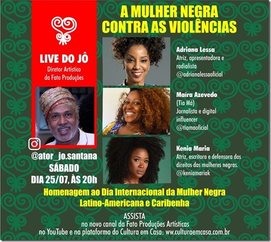 O ator e produtor Jô Santana lança no dia 25, sempre às 20h, no canal do YouTube/fatoproducoesartisticas e na plataforma: www.culturaemcasa.com.br, uma série de onze lives que formam um conjunto de ações em prol do combate ao racismo estrutural no Brasil. Participarão um seleto time de profissionais de diversas áreas para falar sobre os mais significativos assuntos relacionados à luta do movimento negro no país. Nesse primeiro encontro estarão a atriz apresentadora e radialista Adriana Lessa, jornalista e digital influencer Maíra Azevedo e a atriz e digital influencer Erika Maria.