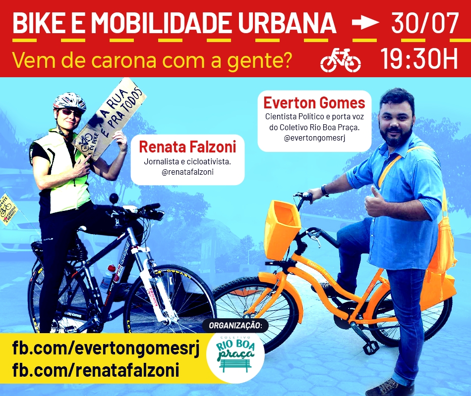 Convidada pelo cientista político Everton Gomes, porta- voz do Rio Boa Praça e vice-presidente da Fundação Leonel Brizola, Renata Falzoni, cicloativista e jornalista de São Paulo, falará sobre Mobilidade Urbana. A transmissão será às 19h30 pelo Facebook.