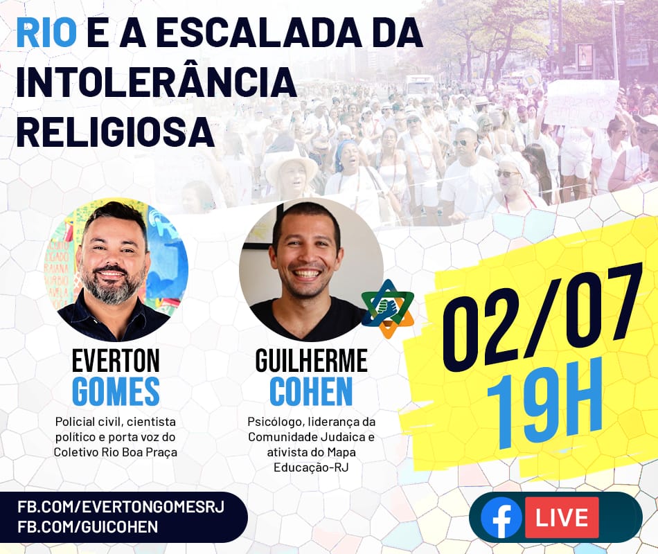 O Rio e a escalada da intolerância religiosa é o tema da live que o cientista político Everton Gomes faz nesta quinta-feira,2, com o psicólogo Guilherme Cohen, fundador de Judeus pela Democracia e líder municipal do Mapa Educação. O encontro será às 19h pelo Facebook de Everton Gomes e Guilherme Cohen.