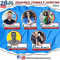Paulo Ramos (PDT-RJ) live sobre Segurança, Cidades e Juventude. O encontro conta com a participação do cientista político Everton Gomes, porta-voz do Coletivo Rio Boa Praça, William Rodrigues, presidente da Juventude Socialista, da advogada Lara Alves, secretaria geral da Juventude Socialista de Goiânia, e de Estephany Neves, diretora da UNE e militante da Juventude Socialista do Maranhão.