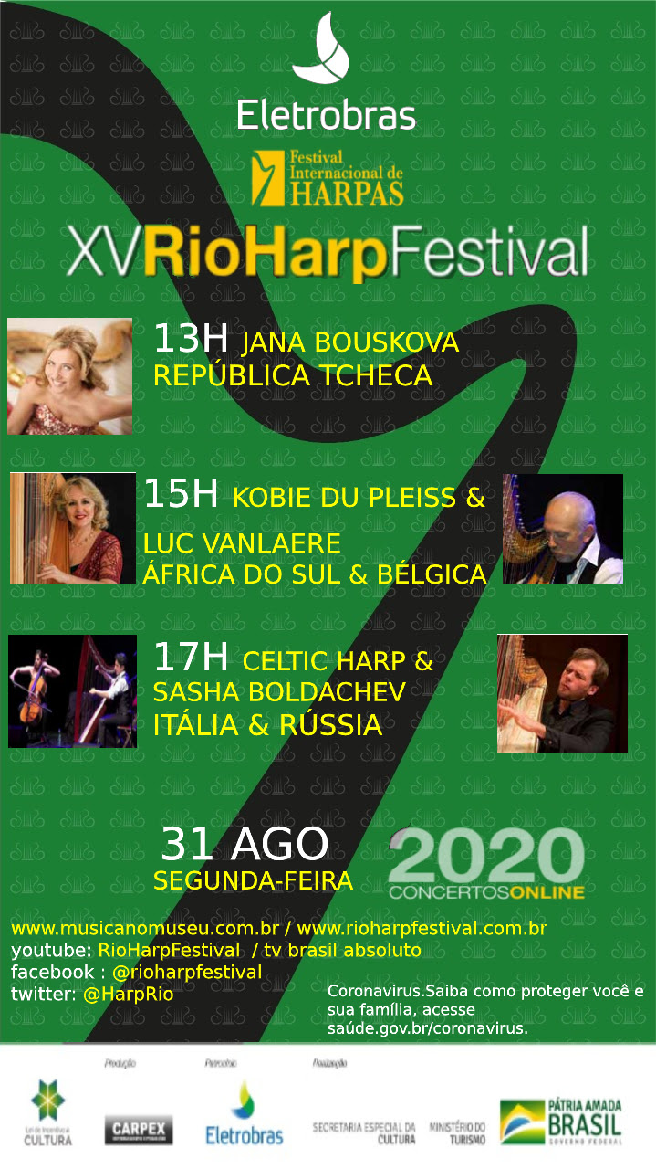 Os organizadores do XV Rio Harp Festival, termina hoje, comemoram o sucesso de público ao longo deste trinta dias de apresentações virtuais. Para acompanhar o último dia de Festival basta acessar as redes do Rio Harp Festival no youtube e FaceBook ou ainda pelos canais digitais da Cedro Rosa. Jana Bouskova da República Tcheca se apresenta às 13h, às 15 é a vez de Kobie Du Pleiss & Luz Vanlaere e para encerrar, às 17h, Celtic Harp & Sasha Boldachev.