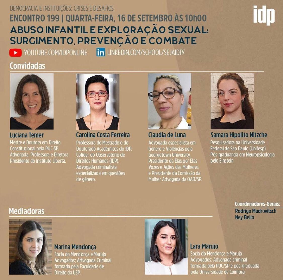 As advogadas Marina Mendonça e Lara Marujo, sócias do escritório Mendonça e Marujo Advogados, serão as mediadoras do painel “Abuso Infantil e Exploração Sexual: Surgimento, Prevenção e Combate”, organizado por elas em parceria com o IDP. O debate será realizado por Luciana Temer, Claudia Luna, Carolina Costa Ferreira e Samara Hipolito Nitzsche. A ideia é uma discussão multidisciplinar sobre o tema. O evento acontece no dia 16, às 10h, e pode ser acompanhado através do canal do IDP no YouTube (https://bit.ly/3mfqXPu).