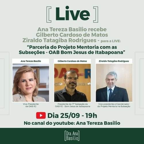 Parceria do Projeto Mentoria com as subseções-OAB Bom Jesus Itabapoana é o tema de live nesta sexta, dia 25, com Ana Tereza Basílio, vice-presidente da OAB-RJ, Gilberto Cardoso de Matos, presidente da OAB de Bom Jesus de Itabapoana, e Ziraldo Tatagiba Rodrigues, vice-presidente e coordenador do Projeto Mentoria na subseção. O encontro virtual será às 19h, pelo Canal youtube de Ana Tereza Basílio.