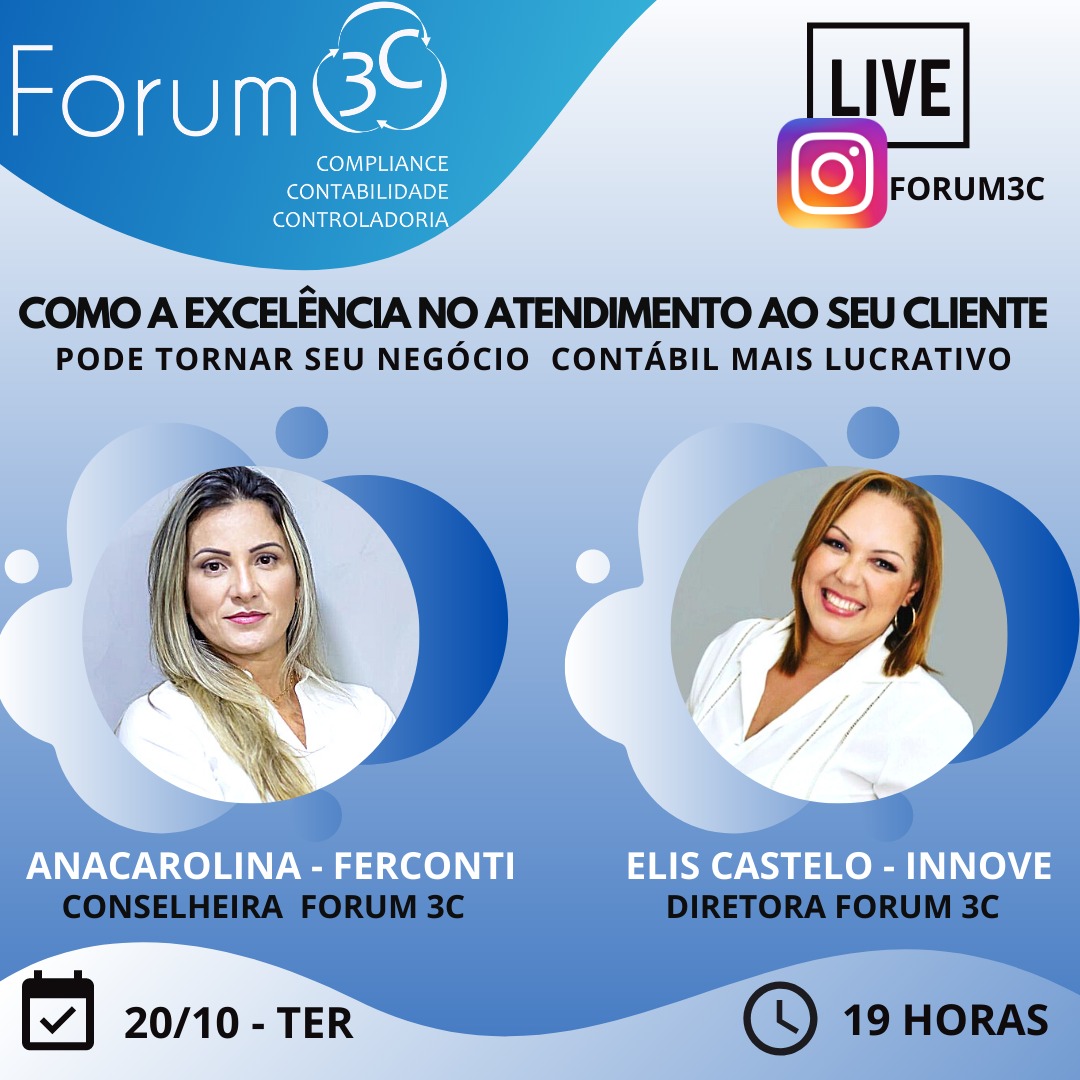 No próximo dia 20 de outubro, às 19h, o Fórum 3C, que reúne mais de 20 empresas de contabilidade pelo país, realiza uma live em seu canal no Youtube, com a conselheira Ana Carolina, da Ferconti, e diretora Elisângela Castelo, da Innove. O tema debatido será “Como a excelência no atendimento ao seu cliente pode tornar seu negócio contábil mais lucrativo”. O acesso será através do link https://bit.ly/2SiGOPt .