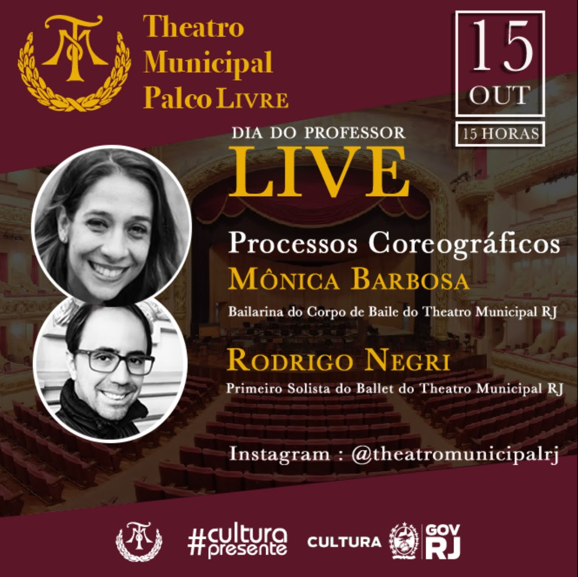 Na próxima quinta, dia 15, será o dia do professor e o Theatro Municipal do Rio de Janeiro vai apresentar a live “Processos Coreográficos”, com dois bailarinos de seu elenco: Mônica Barbosa, bailarina do Corpo de Baile e Rodrigo Negri, primeiro solista do Ballet. O bate-papo será voltado para a trajetória deles como profissionais do Municipal, os trabalhos coreográficos, desde o início, dentro da Instituição e fora dela e como é conciliar a vida nos palcos com a criação de obras coreográficas. O encontro inicia às 15h, no Instagram (@theatromunicipalrj).