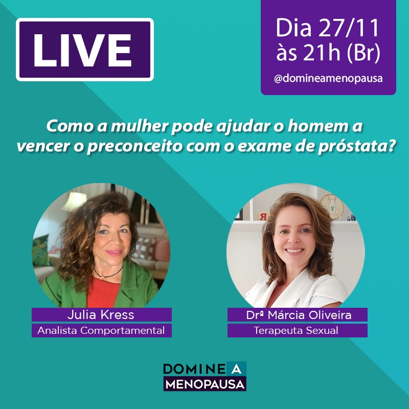 Na sexta-feira (27), à 21h, a especialista em saúde da mulher pelo Advancing Woman Health de Harvard e CEO do Projeto Domine a Menopausa, Júlia Kress, recebe a especialista em saúde da mulher e terapeuta sexual Drª Márcia Oliveira, em uma Live sobre “como a mulher pode ajudar o homem com a autoestima no Novembro Azul”. Para quem estiver interessado em acompanhar, a live será transmitida pelo Instagram @domineamenopausa.