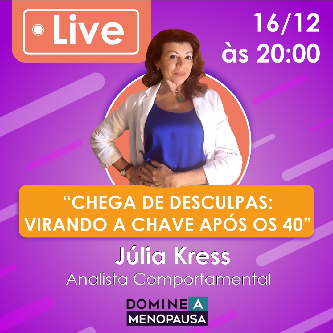 Na quarta-feira (16), às 20h, a especialista em saúde da mulher pelo Advancing Woman Health de Harvard e CEO do Projeto Domine a Menopausa, Júlia Kress, realizará a Live “Chega de desculpas: virando a chave após os 40”. A especialista trará dicas excelentes para a mulher acima dos 40 anos desenhar metas e criar meios de alcançá-las, a importância de ser persistente, como manter foco em uma meta por vez. A Live será transmitida pelo Instagram @domineamenopausa.