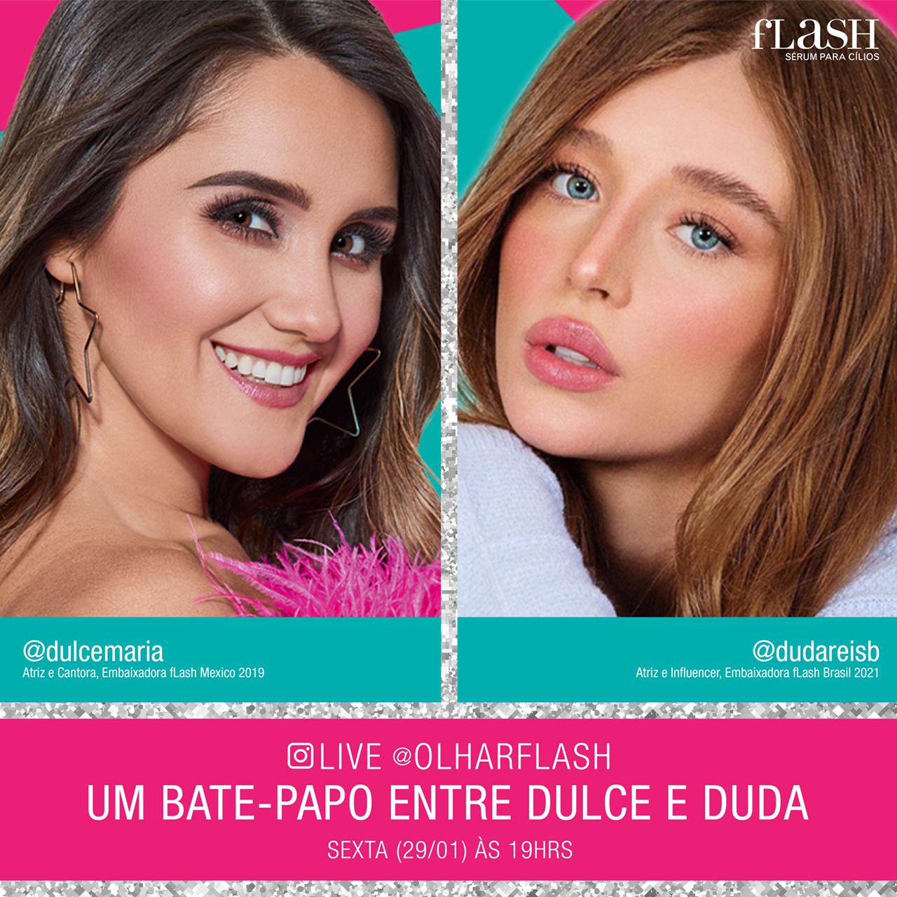 O encontro entre a cantora e atriz mexicana Dulce María e a atriz e influencer brasileira Duda Reis, na live @olharflash, no próximo dia 29, às 19h, promete. No bate-papo as duas beldades vão falar sobre tudo: carreira, autoestima, autocuidado, beleza e ainda vão revelar algumas curiosidades sobre o mundo do beuaté, em especial quando o assunto é sobre cílios.