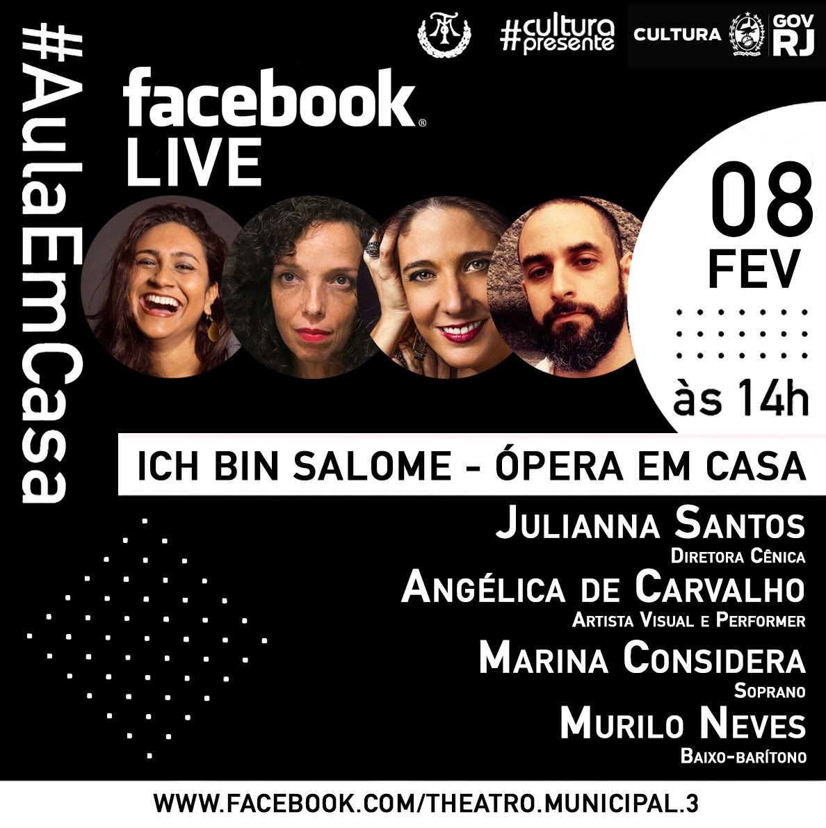 Na próxima segunda, dia 08, com o patrocínio Ouro Vale e Petrobras, a Campanha #AulaEmCasa vai trazer a diretora cênica Julianna Santos, os cantores solistas, Marina Considera e Murilo Neves e a artista visual, Angélica de Carvalho. Eles vão abordar o processo de criação do trabalho Ich Bin Salome – Ópera em Casa em um momento de completo isolamento, desde os assuntos e temáticas relacionados diretamente a obra, até os pontos de vista dos artistas envolvidos. A live começa às 14h, no Facebook do Theatro Municipal.