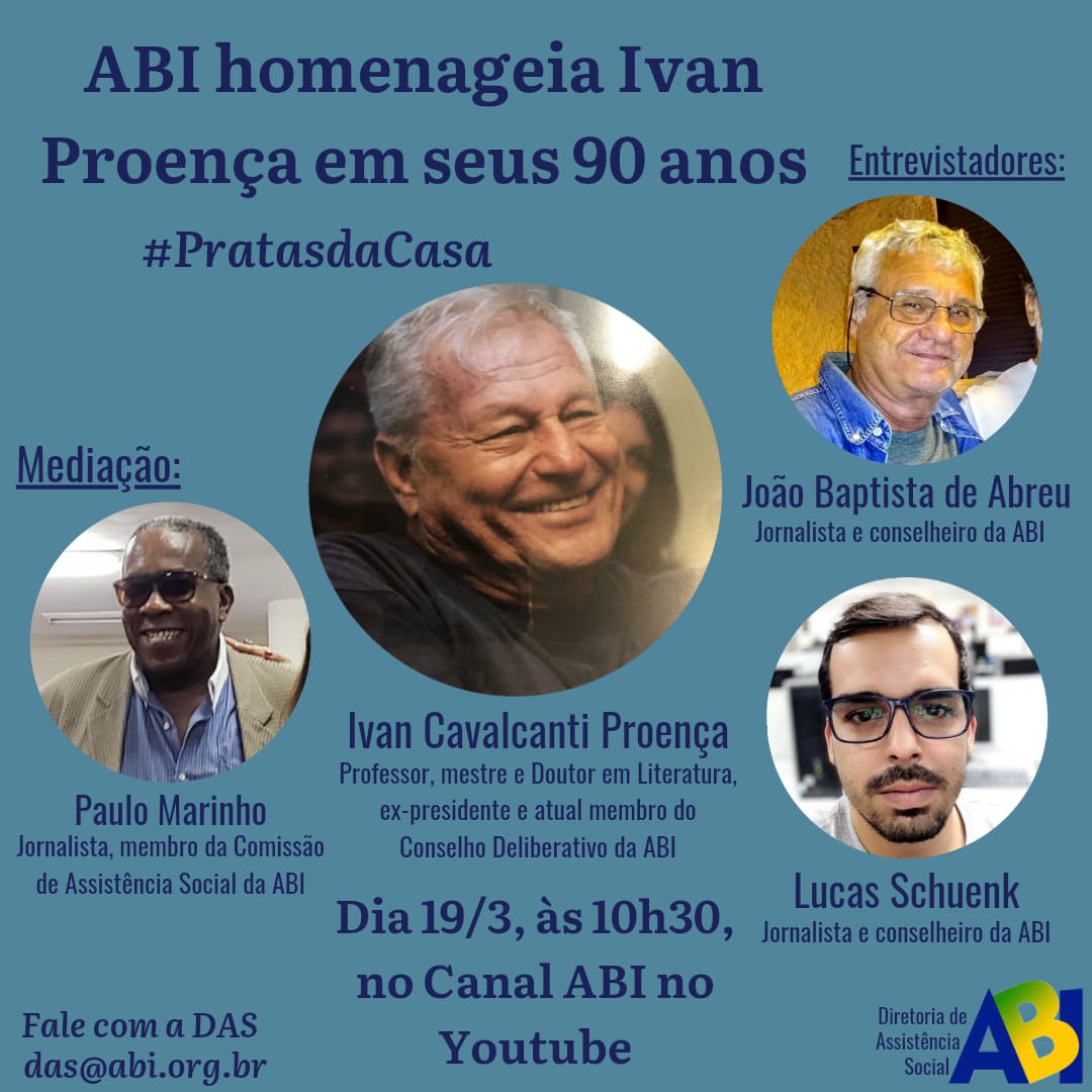 A Comissão de Assistência Social da ABI faz homenagem pelos 90 anos do professor Ivan Proença, membro do Conselho Deliberativo da entidade, com live do Projeto Pratas da casa, que irá ao ar nesta sexta, dia 19, às 10h 30 min, no Canal da ABI no youtube, com a participação de Paulo Marinho (mediação), João Baptista de Abreu e Lucas Schuenk. Integram a Comissão de Assistência Social da ABI , presidida por Rosayne Macedo, os jornalistas Agata Messina, Ana Helena Tavares, Analea Rego, Cleyber Fintelman, Cristina Nunes, Glória Alvarez, Ilza Araújo, José Luiz Laranjo, Malu Fernandes, Maria Inês Estrada, Paulo Marinho, Terezinha Santos, Vilson Romero e Yacy Nunes.