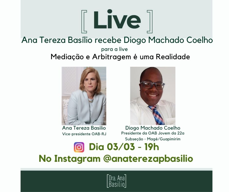 Vice-presidente da OAB-RJ, Ana Tereza Basílio, vai receber para live nesta quarta, dia 3 , às 19h, o presidente da OAB Jovem da subseção de Magé/Guapimirim, Diogo Machado Coelho. O tema do encontro virtual é Mediação e Arbitragem é uma realidade. A transmissão s erá pelo Instagram @Ana Tereza Basilio.