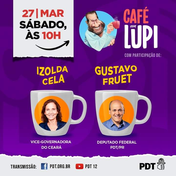 Vice-governadora do Ceará, Izolda Cela, e o deputado federal Gustavo Fruet (do PDT do Paraná) são os convidados do Café com Lupi deste sábado, dia 27, às 10h. O tema do encontro que será mediado pelo presidente nacional do PDT, Carlos Lupi, será a política nacional. A transmissão será pelo Facebook e pelo Youtube. Nesta sexta, dia 26, às 14h, Lupi vai participar do VII Ato pela CPI da Pandemia. O encontro, em desagravo a Felipe Neto e pela Liberdade de Expressão, é promovido pelo Direitos Já Fórum pela Democracia e será transmitido pelo Facebook e pelo youtube do movimento.