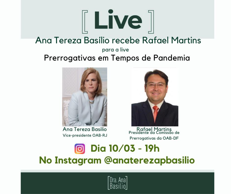 Vice -presidente da OAB-RJ, Ana Tereza Basílio vai receber para live, dia 10, às 19h, o presidente da Comissão de Prerrogativas da OAB-DF, Rafael Martins. O tema do encontro virtual é Prerrogativas em Tempos de Pandemia. A transmissão será pelo Instagram @Ana Tereza Basilio.