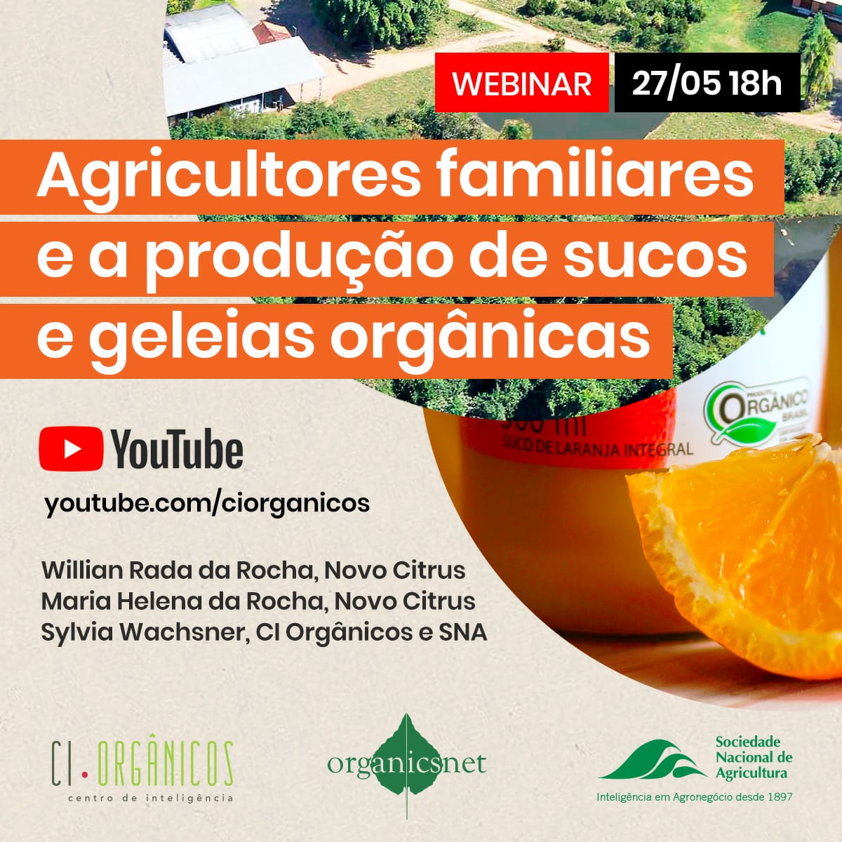 O resultado do projeto de agricultura ecológica desenvolvido pela Novo Citrus é o tema do bate-papo que o Centro de Inteligência em Orgânicos (CI Orgânicos) e a rede OrganicsNet, da Sociedade Nacional de Agricultura (SNA), realizam hoje, a partir das 18h, em seu canal no Youtube. Para conversar sobre produção orgânica, sustentabilidade, energia solar, turismo, entre outros assuntos, o CI Orgânicos convidou o casal de empresários Willian Rada da Rocha e Maria Helena da Rocha. O bate-papo, coordenado pela diretora da SNA, Sylvia Wachsner, pode ser acessado no Canal CI Orgânicos.