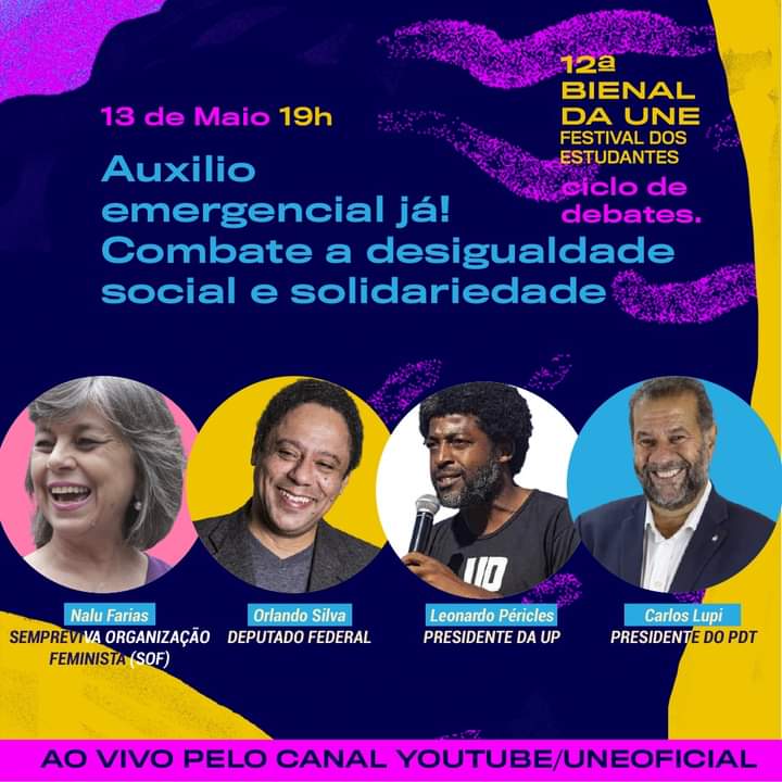 Carlos Lupi, presidente nacional do PDT, é um dos convidados do Ciclo de Debates online do 12ª Bienal da UNE, Festival dos Estudantes, que acontecerá nesta quinta, dia 13, às 19h, pelo canal Yotube da União Nacional dos Estudantes. Também vão participar Nalu Farias, da Organização Feminista Sempre Viva, o deputado federal Orlando Silva, e o presidente da UP, Leonardo Péricles. Entre os temas, o auxílio emergencial, as Desigualdades e a Solidariedade.