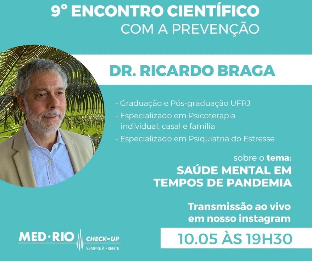 Gilberto Ururahy, diretor da Med-Rio Check-up, vai receber na próxima segunda, dia 10, às 19h30, o especialista em Psicoterapia (Individual, Casal e Família), Ricardo Braga. O tema da palestra é “Saúde Mental em tempos de pandemia”. A transmissão será pelo Instagram @medriocheckup.