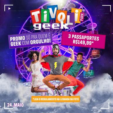 Em homenagem ao Dia Internacional do Orgulho Geek, o Tivoli Park, localizado na Barra da Tijuca, vai oferecer no dia 24, uma promoção aos aficionados por tecnologia, games, quadrinhos, mangás, livros, filmes e séries. Todos os Geeks e seus amigos poderão curtir um dia no parque com um valor promocional! Combo de 3 passaportes custará R$ 149,99. Para participar desta ação, basta acessar o site e seguir o regulamento.