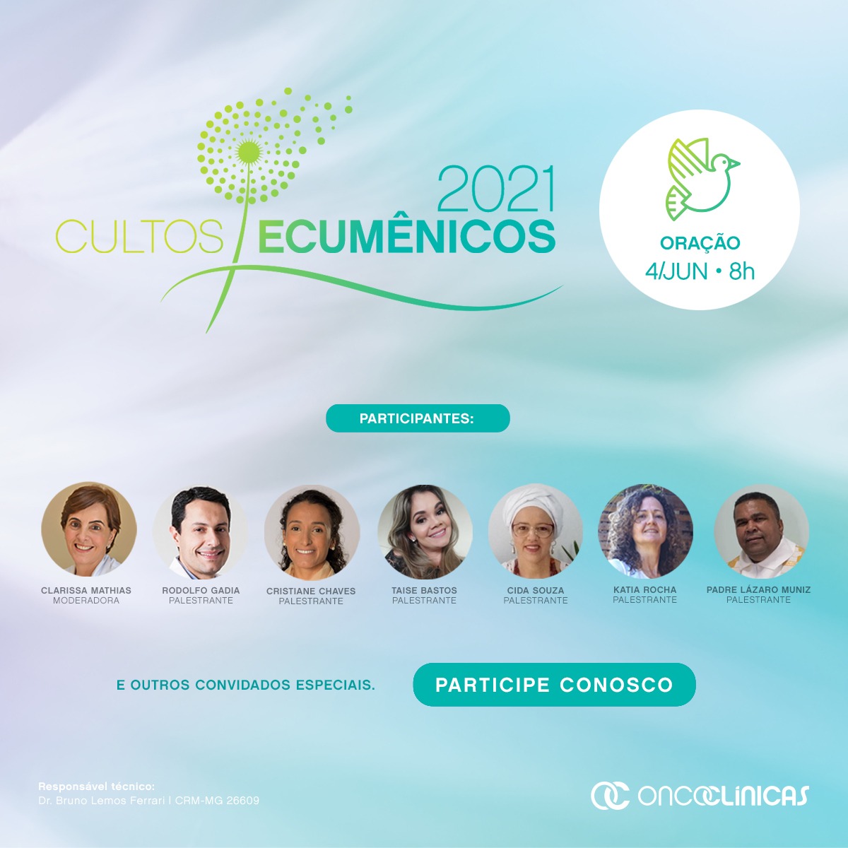 O Grupo Oncoclínicas realiza o 10º Culto Ecumênico de 2021, online, com o tema “O poder da oração”. O encontro acontece hoje às 8h. Entre os convidados, representantes de diferentes estados, profissões e religiões, estão: a presidente da Sociedade Brasileira de Oncologia Clínica, Clarissa Mathias, o oncologista da Oncoclínicas Rodolfo Gadia, e o Padre Lázaro Muniz. Para participar, basta acessar este link no horário do evento: https://cloud.netglobe.com.br/webcast/oncoclinicas4
