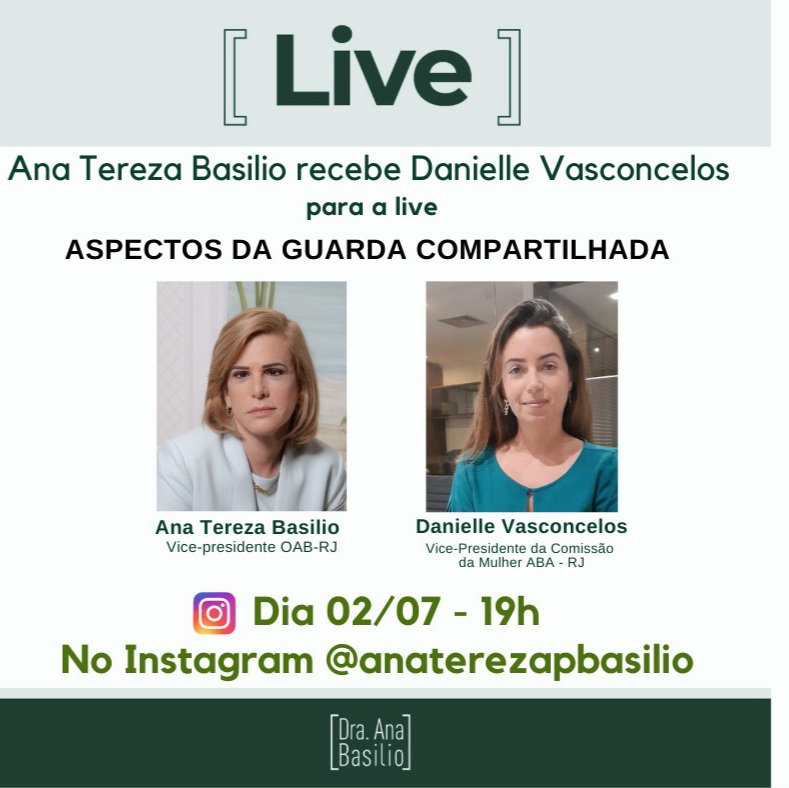 Vice-presidente da Comissão da Mulher da Associação Brasileira de Advogados (ABA), Danielle Vasconcelos, é a convidada da live sobre Aspectos da Guarda Compartilhada, nesta sexta, dia 2 de julho, às 19h, a convite de Ana Tereza Basílio, vice-presidente da OAB-RJ. A transmissão será pelo Instagram de Ana Tereza Basílio.