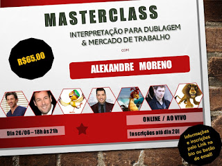 Adam Sandler, Edward Norton, Sean Penn, Dr. Derek Sheperd (Grey’s Anatomy), Pernalonga, Leão Alex (Madagascar)… Estes são alguns dos atores e personagens que ganharam vida nas telas brasileiras através da dublagem de Alexandre Moreno, que irá ministrar a masterclass on-line “Interpretação para Dublagem & Mercado De Trabalho” no dia 26, das 18h às 21h. Esta é uma oportunidade única para quem quer aprender sobre a profissão e conhecer o processo criativo de Moreno que, ao longo de 30 anos de carreira, se consolidou como um dos maiores dubladores do Brasil. A aula é voltada para pessoas a partir de 16 anos, com ou sem experiência na área. Os interessados podem se inscrever até 20, pelo e-mail cursoalexandremoreno@gmail.com.