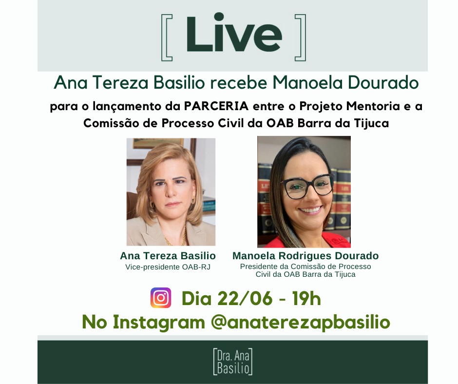 Vice-presidente da OAB-RJ, Ana Tereza Basílio vai receber para live, no dia 22, às 19h, Manoela Dourado, presidente da Comissão de Processo Civil da OAB da Barra da Tijuca. O tema do encontro virtual é o lançamento da parceria entre o Projeto Mentoria e a Comissão de Processo Civil da OAB da Barra da Tijuca. A transmissão será pelo Instagram de Ana Tereza Basílio.