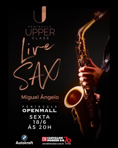 Hoje às 20h tem Upper Class Live Sax com o saxofonista Miguel Ângelo no Península Open Mall! A Live Sax será a atração de inauguração do novo Lounge, conceito da Carvalho Hosken, que estreia com a Experiência Upper Class & BMW ! Curta a Live Sax no Península Open Mall ou assista no Instagram @carvalhohoskenoficial .