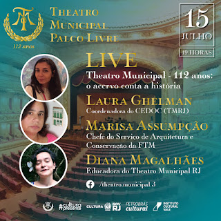 No mês em que o Theatro Municipal do Rio de Janeiro completa 112 anos de vida, o Theatro Municipal Palco Livre apresenta uma série de lives especiais, toda a quinta-feira, às 19h. Na quinta-feira, dia 15, a Coordenadora do Centro de Documentação do Theatro Municipal do Rio de Janeiro (CEDOC), Laura Ghelman e a Chefe do Serviço de Arquitetura e Conservação da Fundação Teatro Municipal, Marisa Assumpção vão bater um papo sobre a construção do Theatro, desde o edital, o material utilizado, comprado em diversas partes do mundo, as estacas, as variações de plantas, o que mudou quando os corpos artísticos passaram a ser incorporados no Municipal e a importância do acervo do Theatro, com sua história, e o destaque para importantes artistas que passaram por um dos mais importantes teatros brasileiros. Como mediadora, a educadora do Theatro Municipal do Rio de Janeiro, Diana Magalhães. A live será exibida https://www.facebook.com/theatro.municipal.3 .