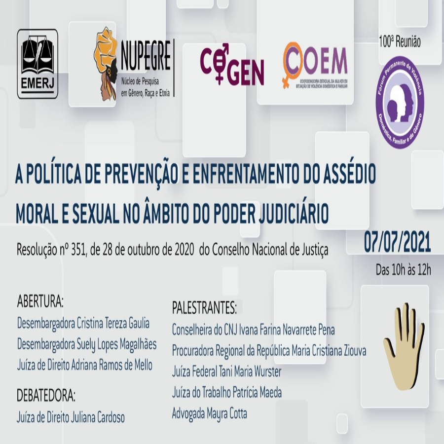 A resolução nº 351, de 28 de outubro de 2020 do Conselho Nacional de Justiça (CNJ), a respeito do enfrentamento do assédio moral e sexual no Poder Judiciário, será tema de debate na Escola da Magistratura do Estado do Rio de Janeiro (EMERJ). O evento “A política de prevenção e enfrentamento do assédio moral e sexual no âmbito do Poder Judiciário”, será dia 7 de julho, às 10h, via Zoom e YouTube, com tradução simultânea para a Língua Brasileira de Sinais (Libras). O encontro é realizado pelo Fórum Permanente de Violência Doméstica, Familiar e de Gênero e pelo Núcleo de Pesquisa em Gênero, Raça e Etnia (NUPEGRE), ambos da EMERJ, em conjunto com o Comitê de Promoção de Igualdade de Gênero, de Apoio às Magistradas e Servidoras e de Prevenção e Enfrentamento do Assédio e da Discriminação (COGEN/TJRJ) e a Coordenadoria Estadual da Mulher em Situação de Violência Doméstica e Familiar (COEM/TJRJ).