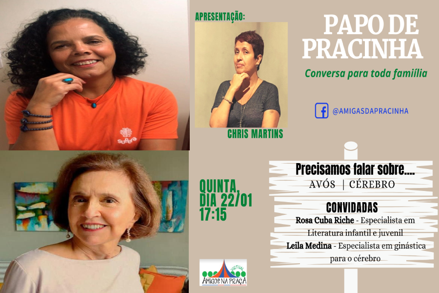 A jornalista Chris Martins vai conversar com Rosa Cuba Riche, mestra e especialista em literatura infantil e juvenil e avó de seis e com Leila Medina, especialista em ginástica para o cérebro. A primeira vai falar destes valores familiares e do quanto a leitura (e a literatura) sempre aproxima as famílias. Enquanto a segunda, vai revelar alguns truques para exercitarmos a memória, no dia em que também se comemora o Dia do Cérebro.