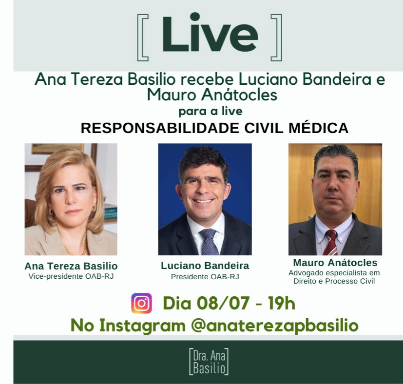 Ana Tereza Basílio, vice-presidente da OAB-RJ, recebe para live, nesta quinta, dia 8, às 19h, o presidente da entidade, Luciano Bandeira, e o advogado Mauro Anátocles, especialista em Direito e Processo Civil. O tema do encontro virtual é Responsabilidade Civil Médica. A transmissão será pelo Instagram de Ana Tereza Basílio.
