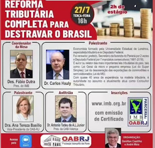 Ana Tereza Basílio, vice-presidente da OAB-RJ, dará palestra em seminário virtual sobre a Reforma Tributária, hoje, às 16h. O encontro terá a participação do desembargador Fábio Dutra, presidente do Instituto dos Magistrados do Brasil (IMB), como coordenador de mesa, do presidente da OAB de Valença, Antonio Tadeu Junior, como anfitrião, e do economista Carlos Hauly, como palestrante . As inscrições podem ser feitas pelo https://www.imb.org.br/ . O acesso é pela plataforma Zoom.