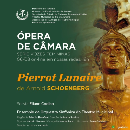Nos 70 anos de morte de Schoenberg, Pierrot Lunaire, uma das mais marcantes obras do revolucionário compositor austríaco, vai tomar conta das redes oficiais do Theatro Municipal do Rio de Janeiro. No dia 06 de agosto, a partir das 18h, o Canal do YouTube vai apresentar um ciclo de vinte e uma canções baseadas nos poemas do belga Albert Giraud, traduzidos para o alemão por Otto Erich Hartleben, para soprano e um pequeno conjunto de câmara. O estilo de canto é o “sprechgesang”, o canto-falado, algo entre o melodrama teatral, a declamação e o canto propriamente dito. Com direção artística de Ira Levin, maestro titular do TMRJ, concepção cênica de Julianna Santos e regência de Priscila Bomfim, maestrina assistente do TMRJ, o espetáculo terá a participação especial da artista lírica brasileira de maior destaque internacional, a soprano que foi Kammersängerin da Ópera de Viena, Eliane Coelho. Ela acaba de completar 70 anos de vida, em plena forma. Esta obra, escrita para a voz feminina e considerada um marco na superação da música tonal, tem sido raramente executada no Brasil.