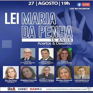 Vice-presidente da OAB-RJ, Ana Tereza Basílio é convidada do Encontro virtual sobre a Lei Maria da Penha, 15 anos, Acertos e Soluções, nesta sexta, dia 27, às 19h, em live pelo facebook. Também vão participar o presidente da CAARJ, Ricardo Menezes, o presidente da OAB de Volta Redonda, Rodrygo Monteiro, Genilda Alcides, delegada da CAARJ (em Volta Redonda), entre outros.