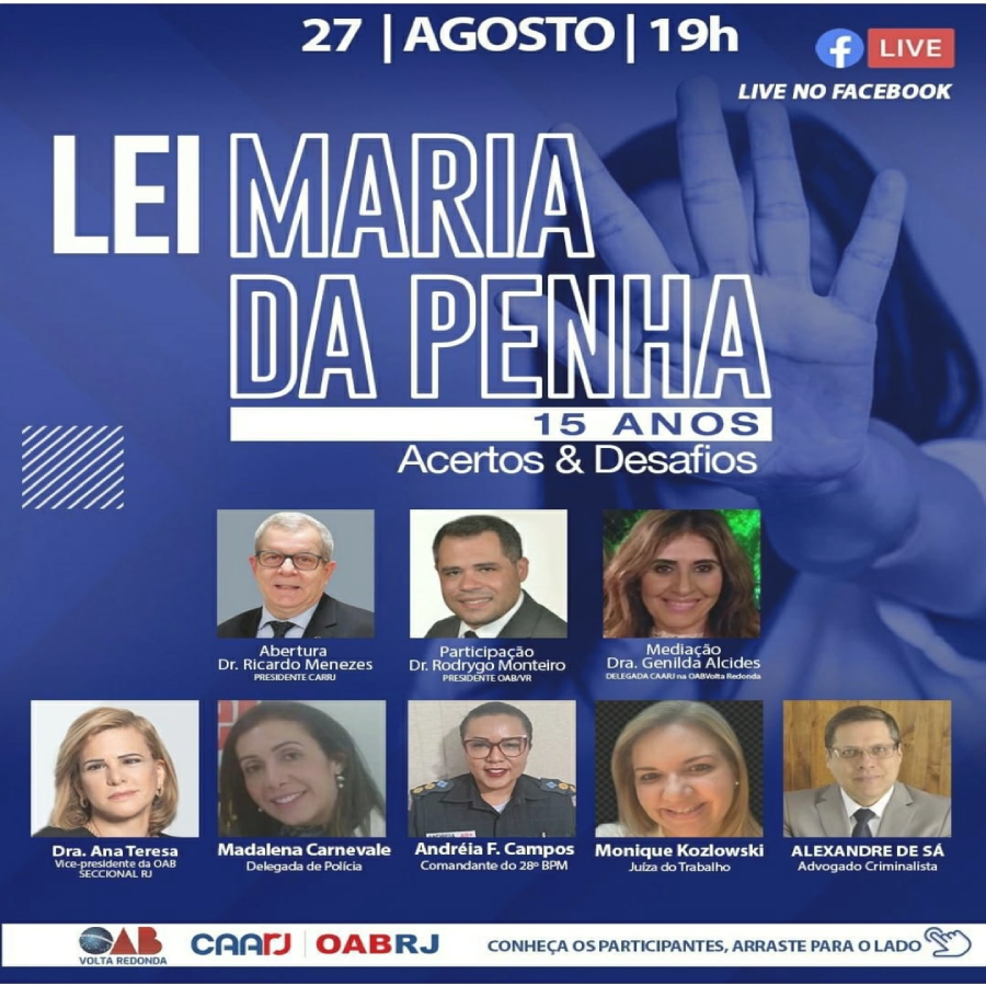 Vice-presidente da OAB-RJ, Ana Tereza Basílio é convidada do Encontro virtual sobre a Lei Maria da Penha, 15 anos, Acertos e Soluções, nesta sexta, dia 27, às 19h, em live pelo facebook. Também vão participar o presidente da CAARJ, Ricardo Menezes, o presidente da OAB de Volta Redonda, Rodrygo Monteiro, Genilda Alcides, delegada da CAARJ (em Volta Redonda), entre outros.