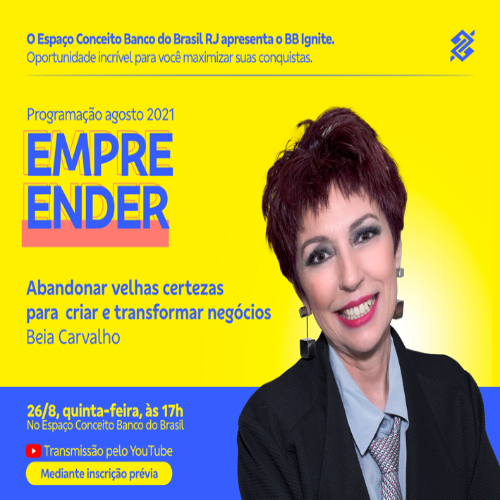 Dia 26, às 17h, a publicitária Beia Carvalho realiza a palestra “Abandonar velhas certezas para criar e transformar negócios”, no Espaço Conceito Banco do Brasil, no Rio, nas instalações do Centro Cultural Banco do Brasil (CCBB). Com transmissão pelo canal youtube.com/bancodobrasil, a atividade é gratuita e as inscrições estão abertas em bit.ly/livespacobb.