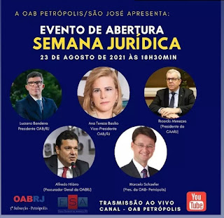 , vice-presidente da OAB-RJ, Luciano Bandeira, presidente da entidade, Marcelo Schaefer, presidente da OAB de Petrópolis, Ricardo Menezes, presidente da Caarj, e Alfredo Hilario, procurador geral da OAB-RJ, vão participar do evento virtual de abertura da Semana Jurídica, hoje, às 18h30. A transmissão será ao vivo pelo Canal OAB de Petrópolis (youtube).