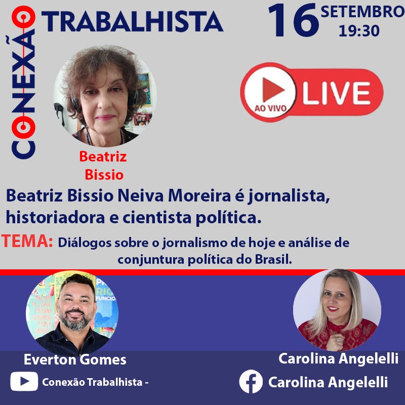 O cientista político Everton Gomes, porta-voz do Rio Boa Praça e diretor da Fundação Leonel Brizola, e a presidente do PDT de Piracicaba, Carolina Angelelli, vão receber para live, pela Conexão Trabalhista, hoje, às 19h30, a jornalista, historiadora e cientista política Beatriz Bissio, que foi editora do Cadernos de Terceiro Mundo durante décadas. A transmissão será ao vivo pelo Youtube da Conexão Trabalhista.