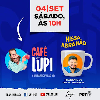 O presidente nacional do PDT, Carlos Lupi, vai conversar com o economista Hissa Abrahão, presidente regional do PDT no Amazonas, neste sábado, dia 4, às 10h, pelo Facebook e pelo youtube. O tema do Café com Lupi será a Amazônia e o atual momento brasileiro.