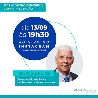 Diretor da Med-Rio Check-up, Gilberto Ururahy será o anfitrião do 13°Encontro Científico com a Prevenção, na próxima segunda, dia 13, às 19h30, na sede da clínica de Botafogo, com palestra do doutor Claudio Gil Araújo, um dos maiores especialistas em Medicina do Esporte do país. O tema do encontro é Atividade Física. A transmissão ao vivo será pelo Instagram da Med-Rio Check-Up.
