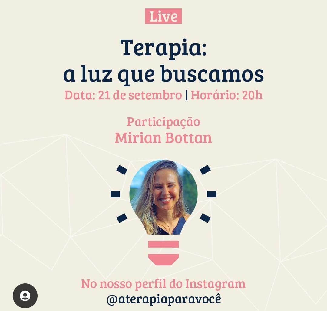 A jornalista e influenciadora Mirian Bottan é a convidada do mês da Aterapia para uma live sobre como o apoio psicológico auxilia nos processos de mudança de vida. Com o tema: “Terapia, a luz que buscamos”, a convidada irá compartilhar sua história de superação após 16 anos convivendo com transtornos alimentares. O talk acontece hoje, às 20h. Para assistir, basta acessar o link de cadastro: https://bit.ly/39mTjSQ.