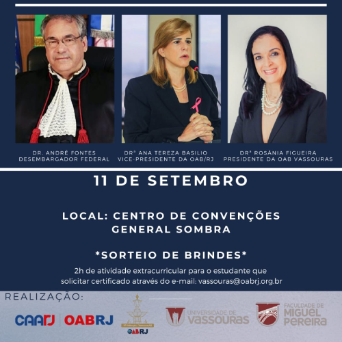 Ana Tereza Basílio, vice-presidente da OAB-RJ, e o desembargador André Fontes são os convidados da presidente da OAB de Vassouras, Rosânia Figueira, no seminário que acontecerá neste sábado, às 14h, no Centro de Convenções General Sombra (em Vassouras). O evento tem o apoio da OAB-RJ e da CAARJ. As inscrições podem ser feitas pelo link https://tinyurl.com/3v2kh2ex.