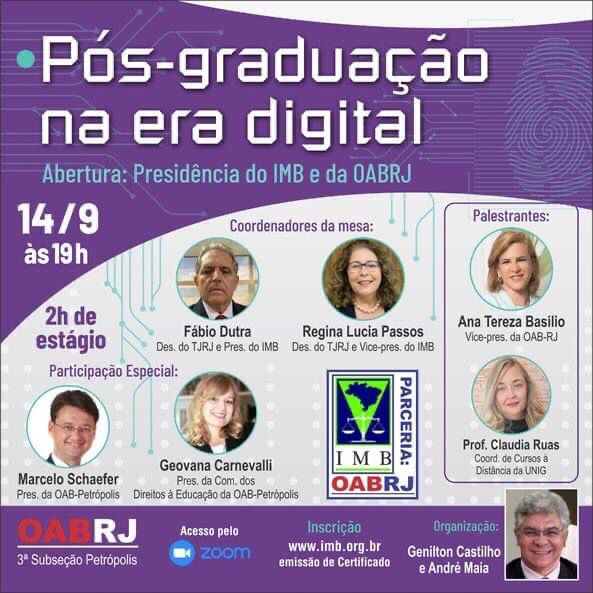 Ana Tereza Basílio, vice-presidente da OAB-RJ, e Claudia Ruas, coordenadora de cursos à distância da UNIG, são os palestrantes do seminário Pós-graduação na era digital, que acontece hoje , às 19h, pelo Zoom. Os coordenadores da mesa de debates são os desembargadores Fábio Dutra, e presidente do IMB, e Regina Lúcia Passos, vice-presidente da entidade. Também vai participar do encontro o presidente da OAB de Petrópolis, Marcelo Schaefer.