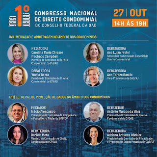 Mediação e Arbitragem no Âmbito dos Condomínios é o tema do painel Mediação e Arbitragem no âmbito dos condomínios, que acontecerá hoje, às 16h, no congresso do Conselho Federal da OAB, que terá como debatedoras Ana Tereza Basílio, vice-presidente da OAB-RJ, Ana Luiza Pretel, secretária da comissão especial de Direito Condominial e a advogada Wania Baeta, da Comissão de Direito Condominial do CFOAB. As inscrições para o encontro virtual podem ser feitas pelo site da OAB (oab.org.br/eventosoab).