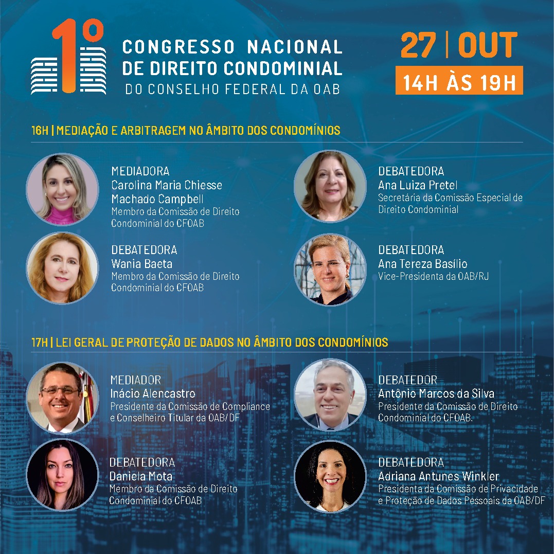 Mediação e Arbitragem no Âmbito dos Condomínios é o tema do painel Mediação e Arbitragem no âmbito dos condomínios, que acontecerá hoje, às 16h, no congresso do Conselho Federal da OAB, que terá como debatedoras Ana Tereza Basílio, vice-presidente da OAB-RJ, Ana Luiza Pretel, secretária da comissão especial de Direito Condominial e a advogada Wania Baeta, da Comissão de Direito Condominial do CFOAB. As inscrições para o encontro virtual podem ser feitas pelo site da OAB (oab.org.br/eventosoab).